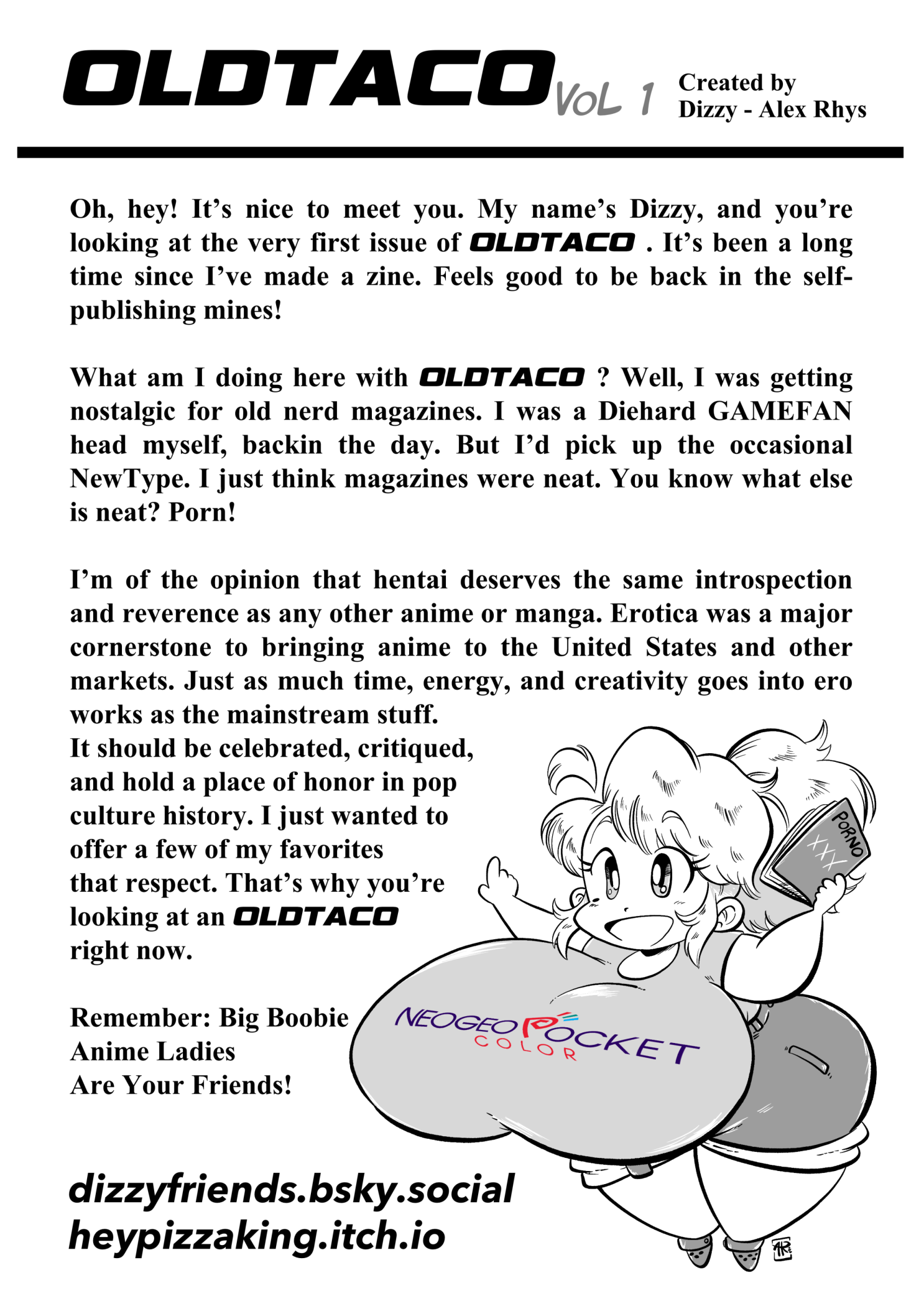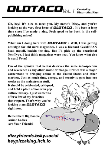 OLDTACO is my first attempt at an “adult” zine. Made as an expression of love for a handful of classic and new ero media. 36 pages of essays and art about some stuff I was always afraid to admit I dig until now.